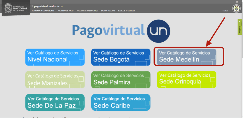 Cuando ingresemos a Pagovirtual seleccionamos la opción resaltada donde dice: “Ver Catalálogo de Servicios Sede Medellín”
