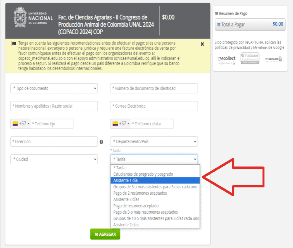 Diligencie su información personal y selecciona la tarifa o tipo de asistencia al evento.