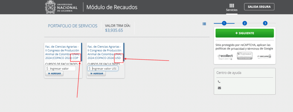 Selecciona la forma de pago que le corresponda. Ya sea COP(Pesos Colombianos) ó USD(Dólares Americanos)
